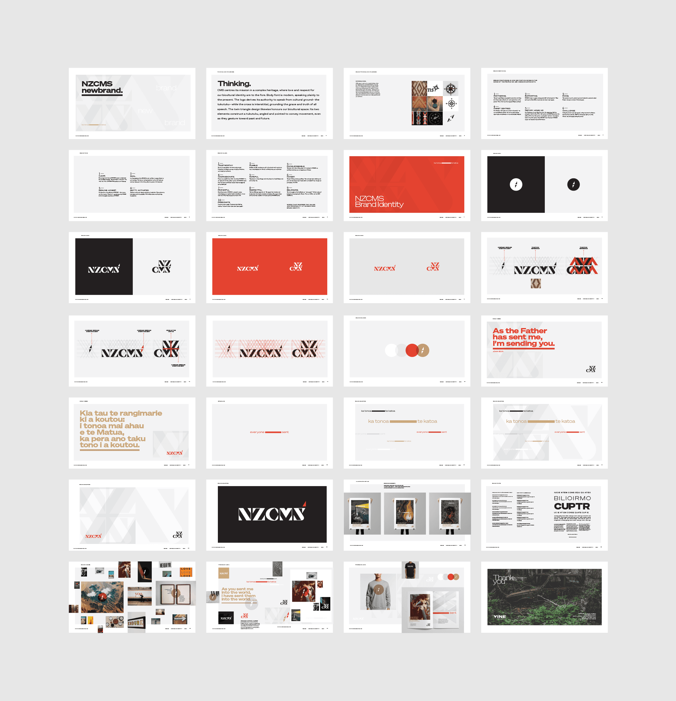 The NZCMS brand is built around a simple but powerful truth, everyone is sent. Rooted in John 20:21, “As the Father has sent me, I am sending you”, the identity captures the call at the heart of the Gospel, that mission is not for a few, but for all. It speaks with clarity and confidence, grounded in heritage, where love and respect for Aotearoa’s bicultural identity are to the fore, while a modern voice communicates plainly into the present. The visual identity draws its authority from cultural ground. The logotype is formed through angular, interwoven shapes inspired by tukutuku, expressing meaning, structure, and whakapapa, with the cross seamlessly stitched into one of the forms, grounding the grace and truth of all expression. Alongside this, the icon takes shape as a twin triangle structure, honouring a bicultural space, its two elements angled forward to convey movement while gesturing to both past and future. This same form functions as a compass, pointing outward and guiding direction.